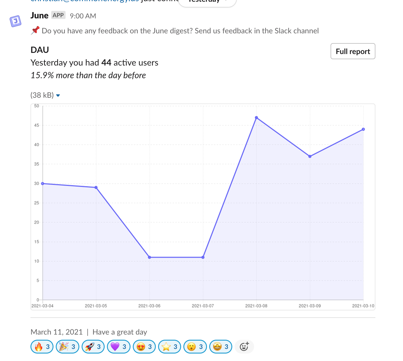 Pro tip If you're using June you can add these tracking events to your Active users report and receive a daily update in Slack that looks like this